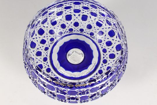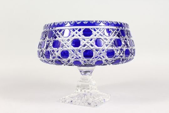 A CUT BLUE CRYSTAL BOHEMIAN CIRCULAR BOWL on square stand. 8ins diameter.