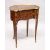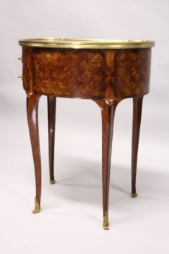 A LOUIS XVITH KIDNEY SHAPED PARQUETRY INLAID TABLE, with ormolou mounts, sliding panel to the front and two drawers to one side, supported on curving legs.