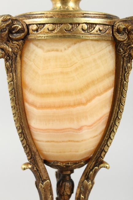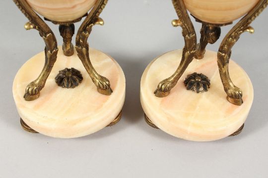 A GOOD PAIR OF GILDED BRONZE AND MARBLE CASSOLETTES with reversible tops, rams masks, on circular marble bases.
