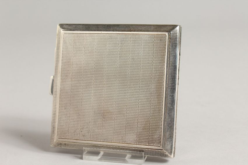 A GEORGE V ENGINE TURNED SILVER CIGARETTE CASE, the top with an enamel of a woman with blonde hair.