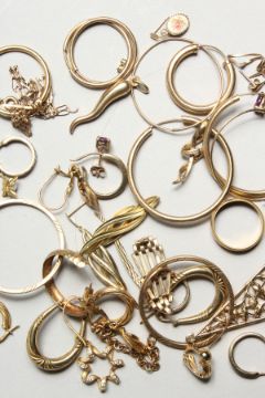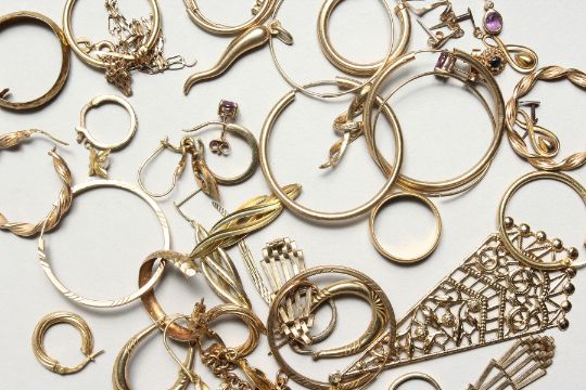 A BAG OF MIXED BIJOUTERIE, HOOP EARRINGS, STUDS, WEDDING RING ETC.