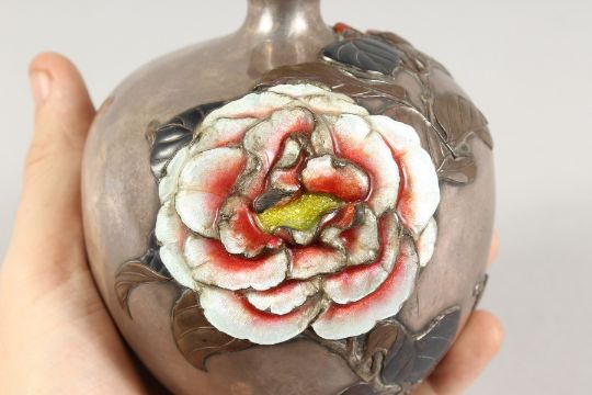 A JAPANESQUE SILVER AND ENAMEL BULBOUS VASE decorated with flowers and leaves in relief.