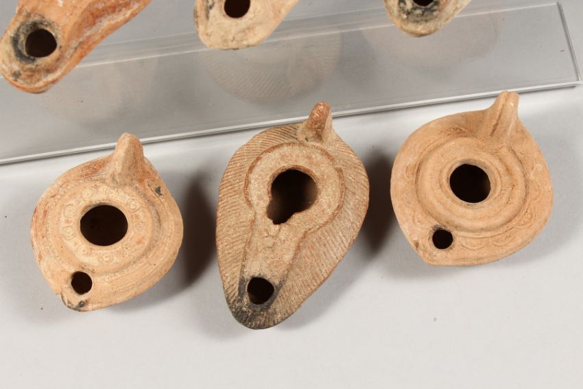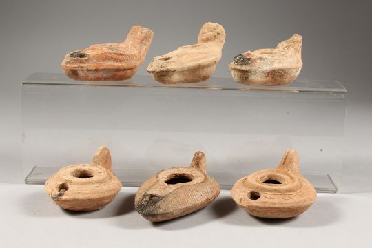 SIX ROMAN POTTERY OIL LAMPS.