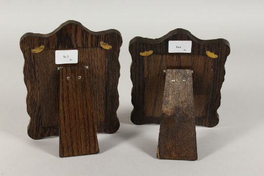 A PAIR OF SILVER UPRIGHT PHOTOGRAPH FRAMES with serpentine top and repousse decoration.
