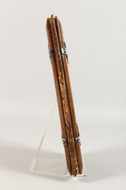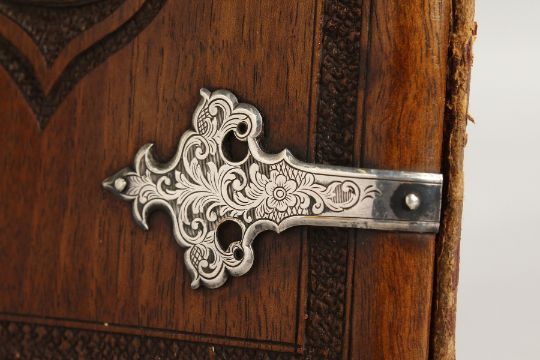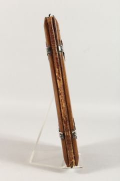 A SILVER MOUNTED WOODEN BLOTTER, carved with a crest.