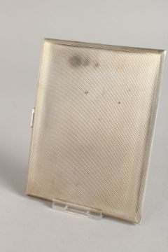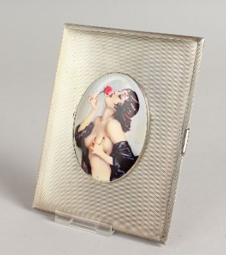 AN ELIZABETH II ENGINE TURNED SILVER CIGARETTE CASE, the top with an enamel of a semi-nude with a red rose.