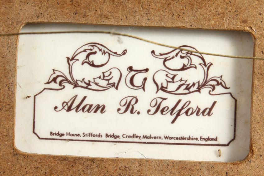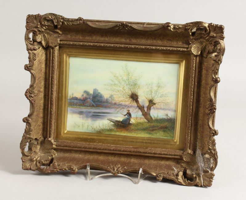 AN ENGLISH PORCELAIN PLAQUE painted with a young woman in a boat with a church in the distance by Ex-Royal Worcester artist Alan Telford, signed.