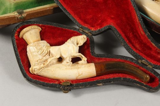 A SMALL CARVED HORSE MEERSCHAUM PIPE in a leather case, a spare case and another (AF) (3).