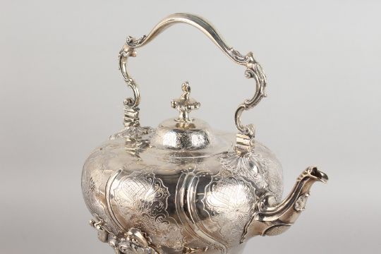 A SUPERB PAUL STORR GEORGE III SILVER TEA KETTLE, STAND AND BURNER.