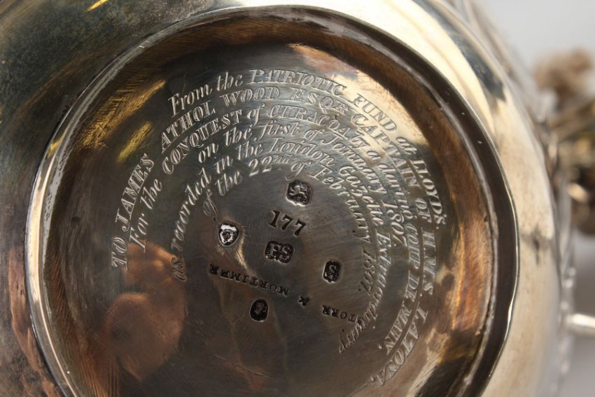 The base inscribed "FROM THE PATRIOTIC FUND at LLOYDS, TO JAMES ATHOL WOOD ESQ., CAPTAIN OF HMS LATON, for the CONQUEST of CURACAO by a daring COUP DE MAIN on the first day of January 1807 and recorded in the London Gazette Extraordinary on the 22nd February 1807.