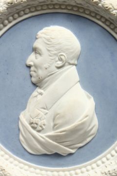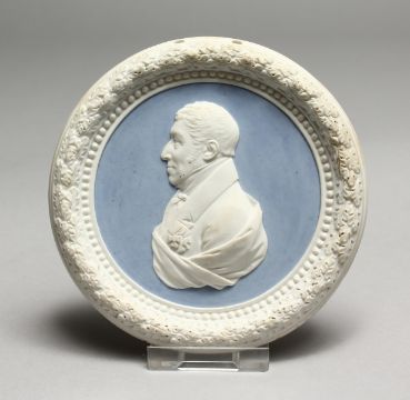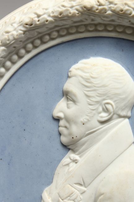 A SEVRES BLUE AND WHITE CIRCULAR PORTRAIT PLAQUE.