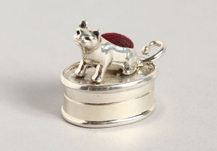 A TINY SILVER CAT ON A SNUFF BOX PIN CUSHION.