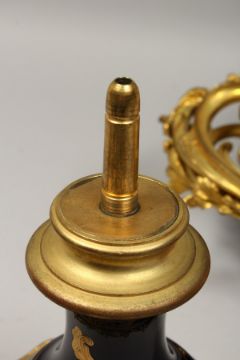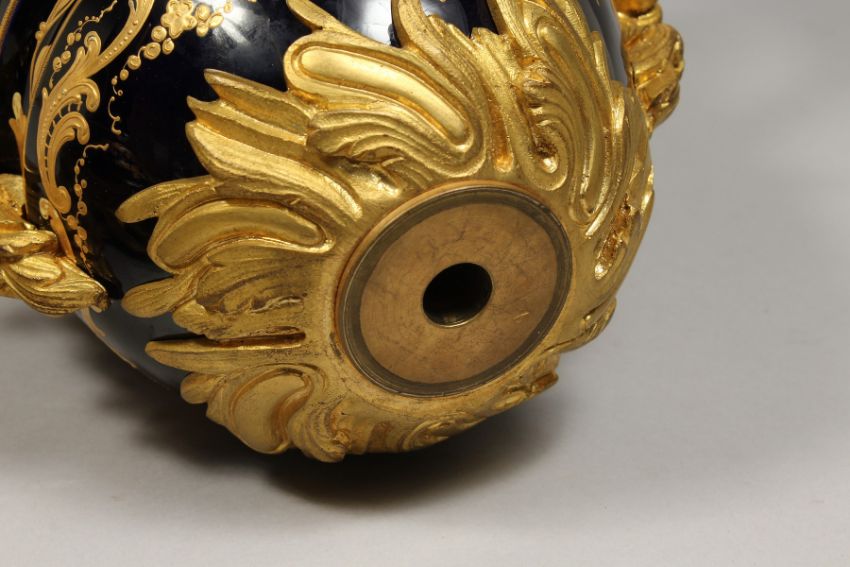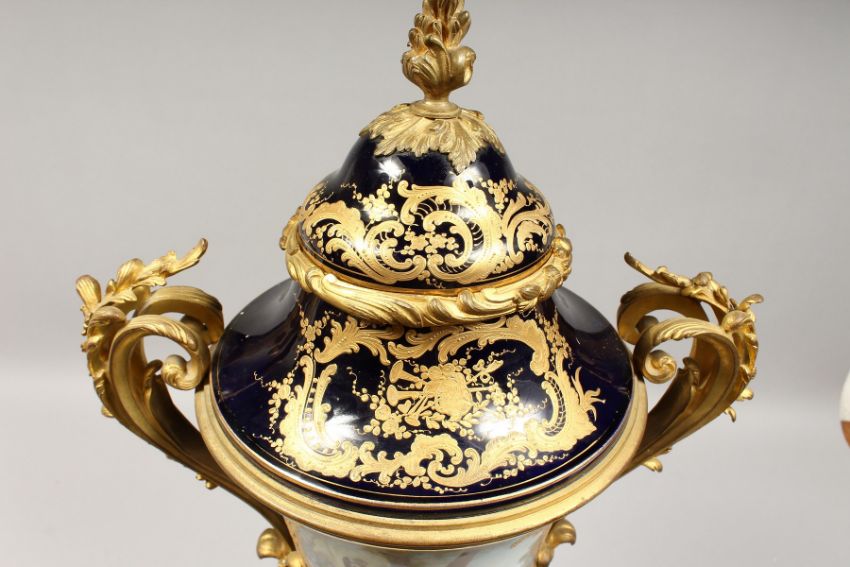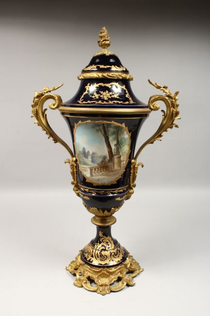 A SUPERB LARGE SEVRES TWO-HANDLED URN VASE AND COVER, the rich blue ground edged in gilt, painted with a scene of young lovers and garden setting.