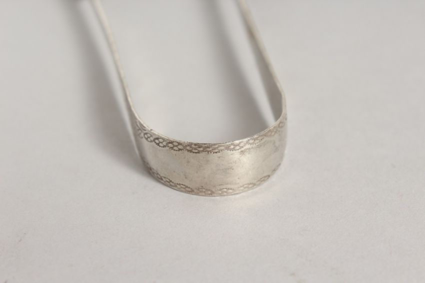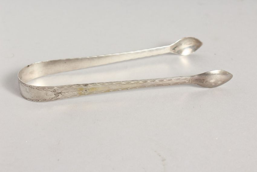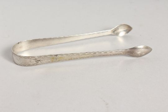 A PAIR OF GEORGIAN BRIGHT CUT SILVER SUGAR TONGS.