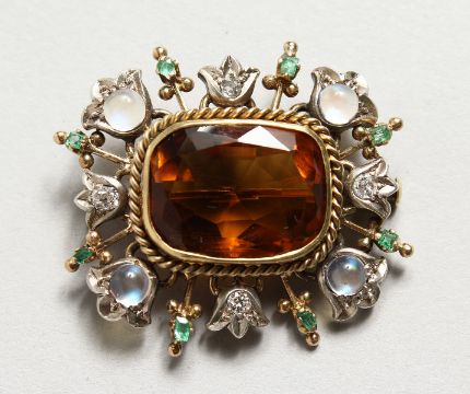 A VICTORIAN CITRINE AND MOONSTONE BROOCH.