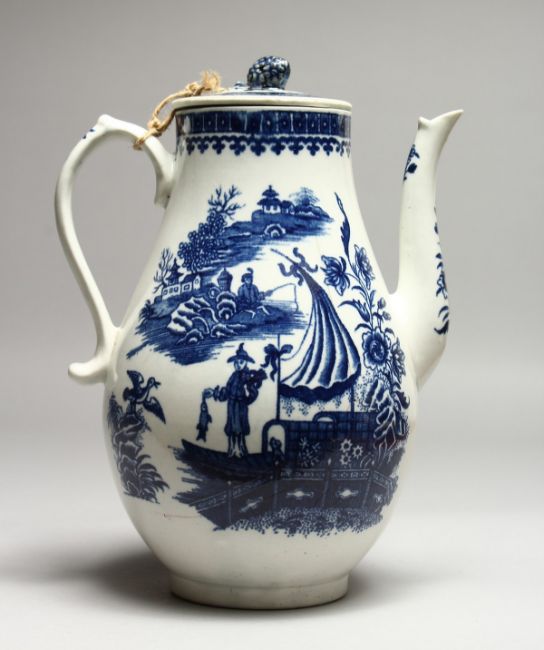 A CAUGHLEY BLUE AND WHITE WILLOW PATTERN COFFEE POT AND COVER, (fisherman pattern).