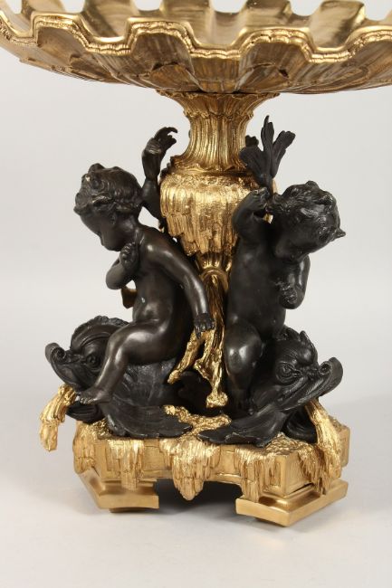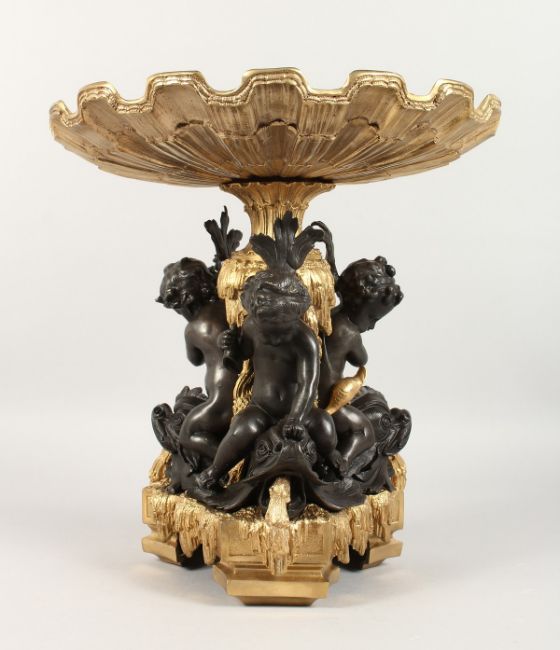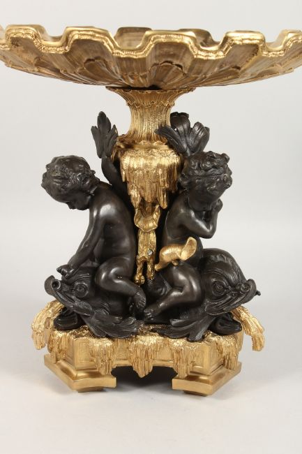 A GOOD GILT BRONZE AND ORMOLU SHELL TAZZA, supported by three bronze cupid.