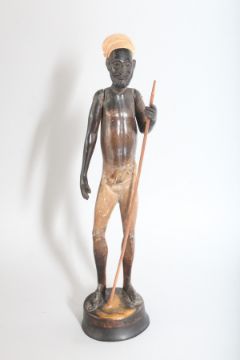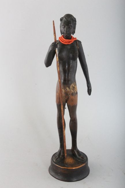 A PAIR OF CARVED WOOD STANDING FIGURES IF A MAN AND WOMAN on circular bases.