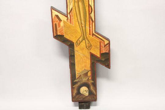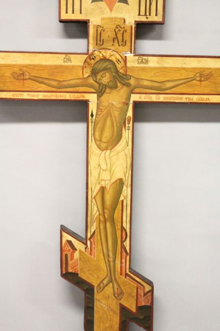 A LARGE 18th / 19th CENTURY RUSSIAN ORTHODOX PAINTED WOODEN DOUBLE SIDED THREE BAR CROSS.