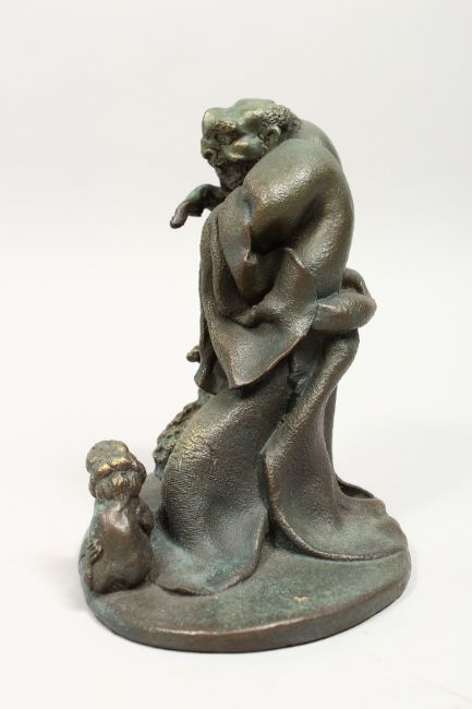 A SMALL GREEN PATINATED BRONZE GROUP, depicting an old man, a lion dog at his feet.
