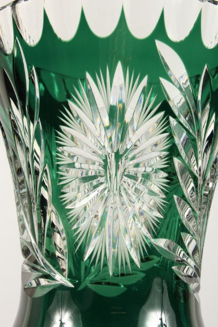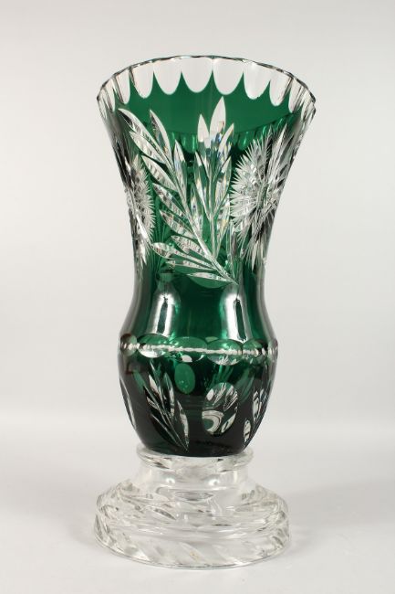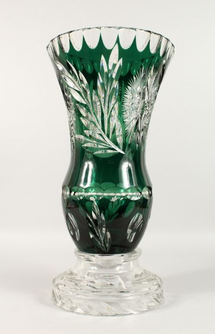 A LARGE BOHEMIAN GREEN CUT GLASS VASE on a plain circular base.