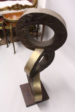 A GOOD LARGE BRONZE SCULPTURE OF THREE CIRCLES JOINED TOGETHER, each with abstract moulded decoration to the sides, on a square base.