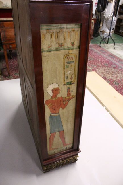 A RARE EGYPTIAN REVIVAL PAINTED OPEN FRONTED BOOKCASE of tapering form, the top with applied giltwood birds, painted Egyptian figures to the sides and applied giltwood decoration to the base.