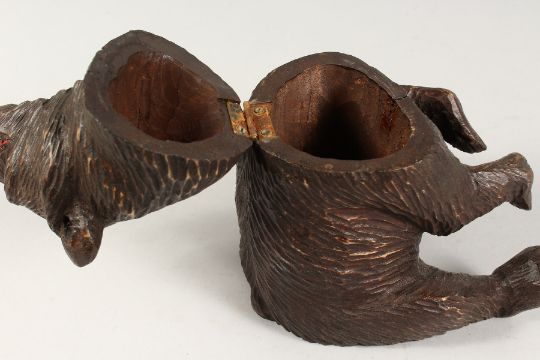 A BLACK FOREST CARVED WOOD SEATED BEAR TOBACCO JAR with glass eyes.