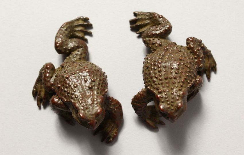 A SMALL PAIR OF JAPANESE BRONZE TOADS.