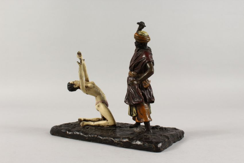 A GOOD AUSTRIAN PAINTED COLD CAST GROUP, an Arab and a young lady.