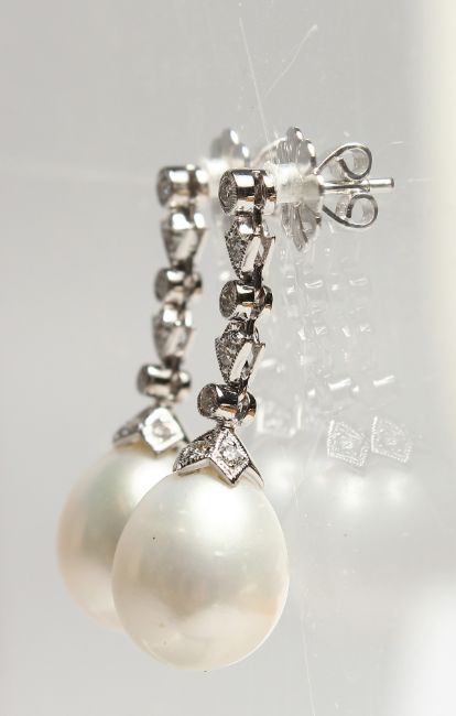 A SUPERB PAIR OF 18CT WHITE GOLD, PEARL AND DIAMOND DROP EARRINGS.