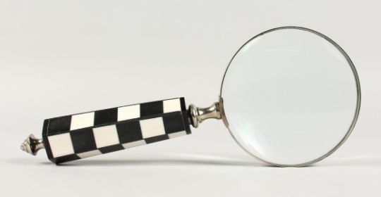 A MAGNIFYING GLASS with chequered handle.