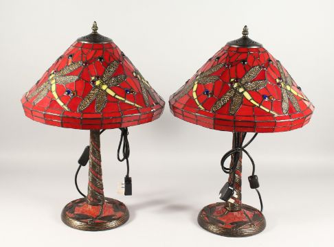A GOOD PAIR OF TIFFANY DESIGN DRAGONFLY LAMPS.