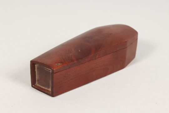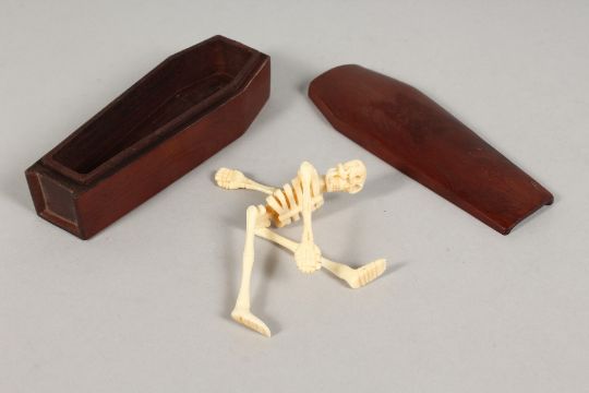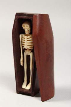 A CARVED ARTICULATED BONE SKELETON in a wooden coffin.