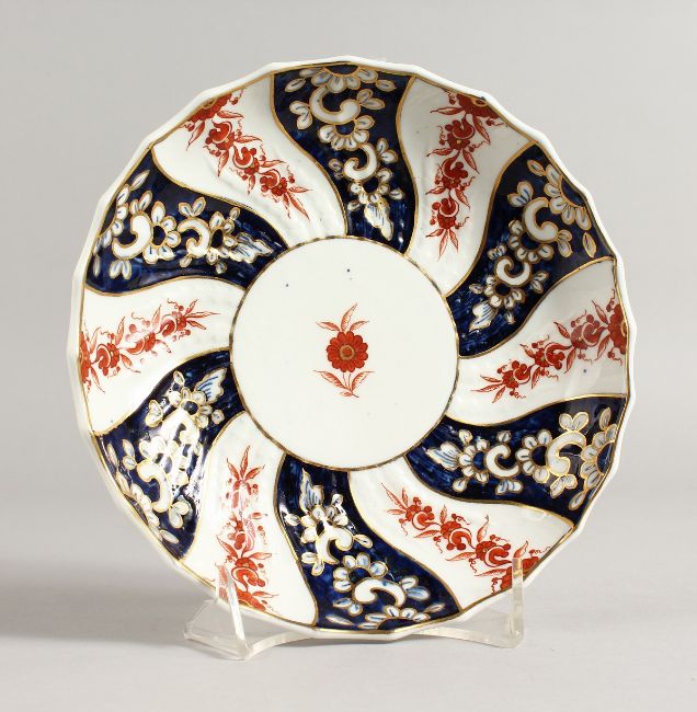 AN 18TH CENTURY CHELSEA DERBY SAUCER SHAPED DISH painted with a version of the Queen Charlotte pattern, anchor D mark in gold.
