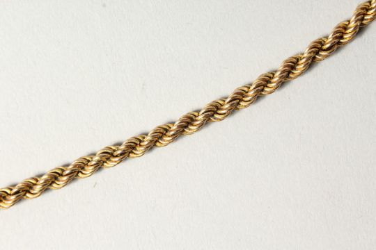A 9CT GOLD ROPE NECKLACE.