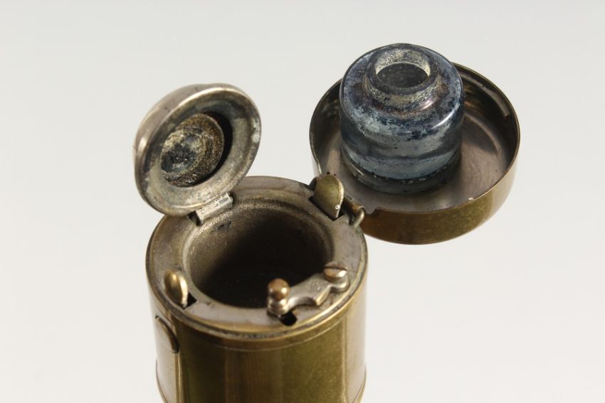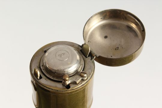 A 19TH CENTURY WALKING CANE with brass top opening to reveal an inkwell.