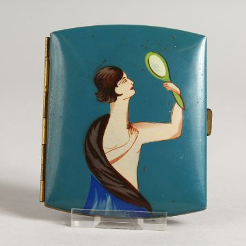 A METAL CIGARETTE CASE, the top with a girl with hand mirror.