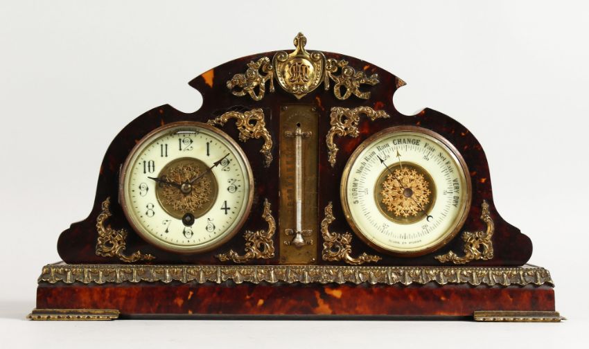 A VERY GOOD 19TH CENTURY FRENCH TORTOISESHELL CASE CLOCK, THERMOMETER AND BAROMETER, CIRCA. 1860.
