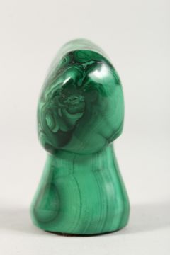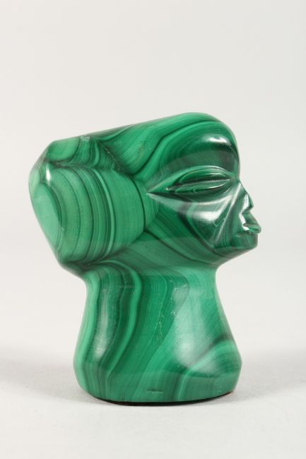 A CARVED MALACHITE TRIBAL HEAD.
