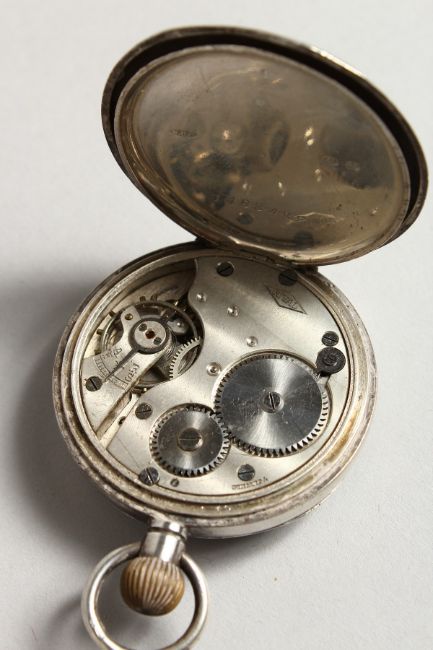 A PLAIN VICTORIAN SILVER POCKET WATCH, the top with an enamel nude.