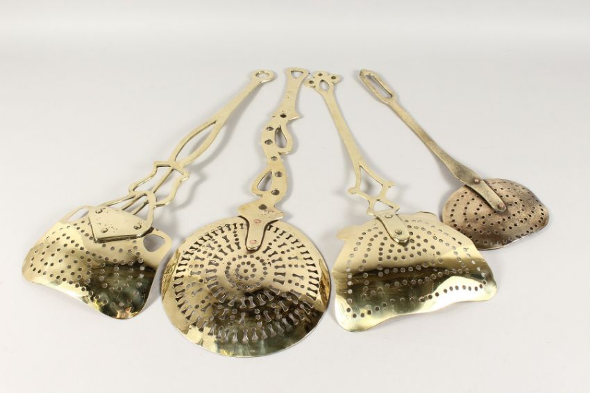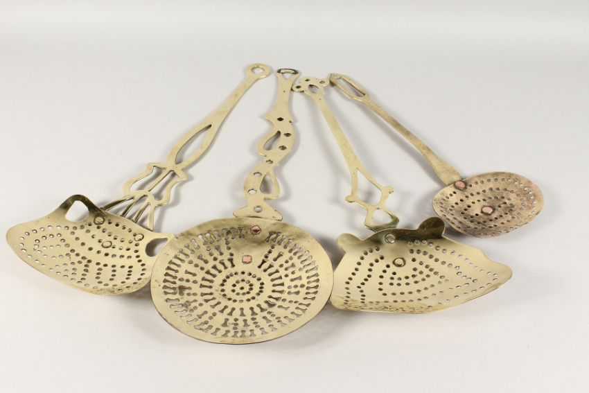 FOUR BRASS MILK SKIMMERS.
