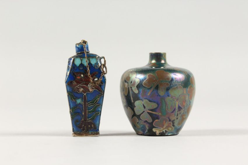 A TINY IRIDESCENT GLASS VASE decorated with clovers, 1.75ins high, and a CLOISONNE SCENT BOTTLE (2).