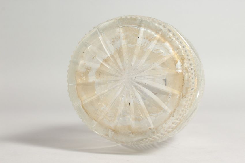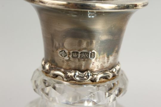 A CUT GLASS DECANTER AND STOPPER with silver band.