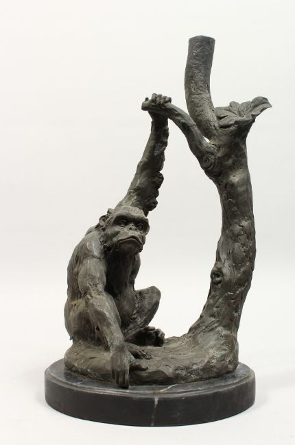 A CAST BRONZE GROUP OF A CHIMP SEATED BY A TREE, on a marble base.