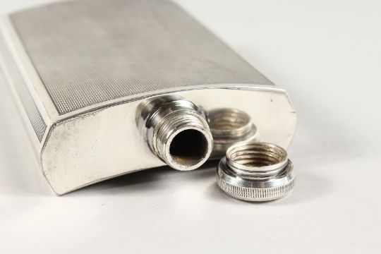 A WALKER & HALL ENGINE TURNED E.P.N.S. WHISKY FLASK.