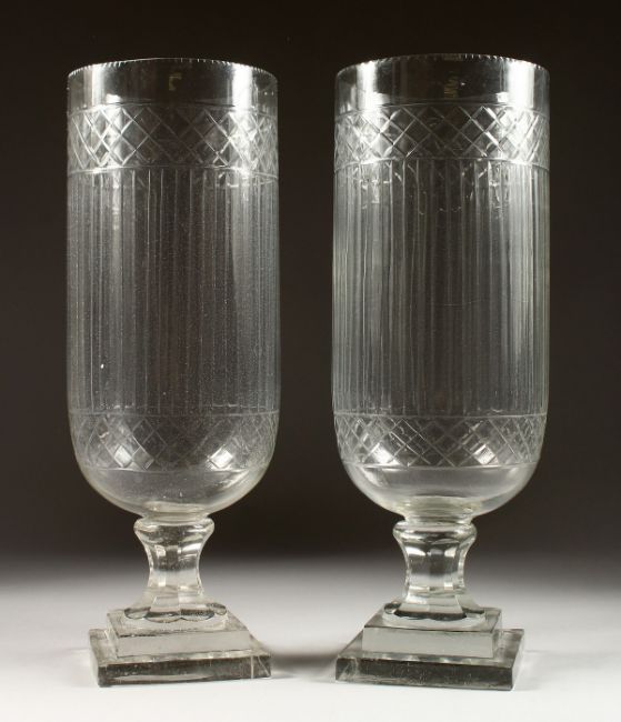 A PAIR OF CUT GLASS STORM LAMPS on square bases.