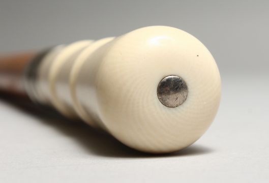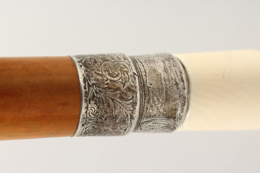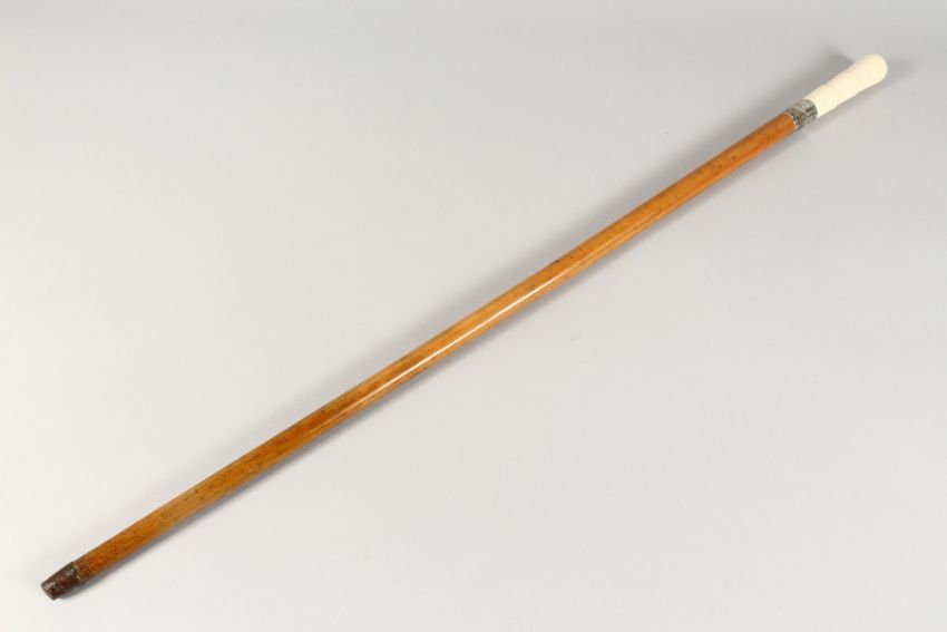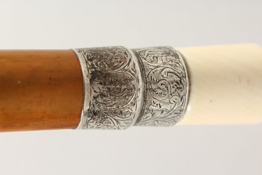A VICTORIAN TURNED IVORY HANDLED WALKING STICK with engraved silver band.