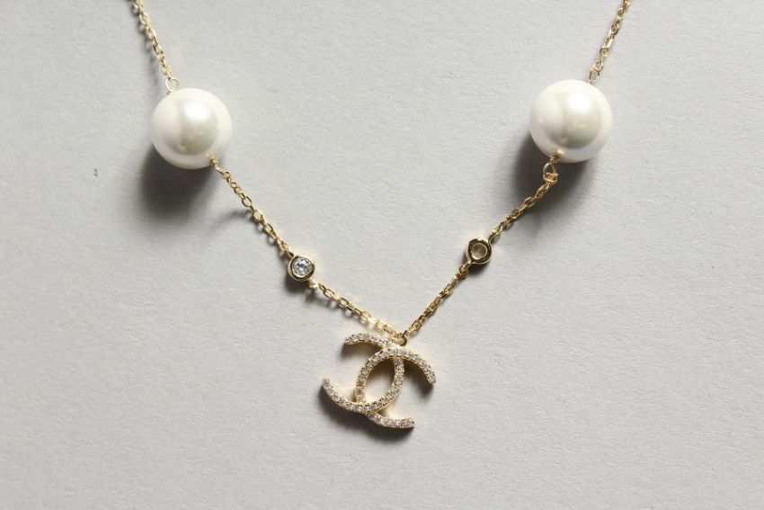A SILVER GOLD-PLATED "ENTWINED C" PEARL NECKLACE.