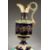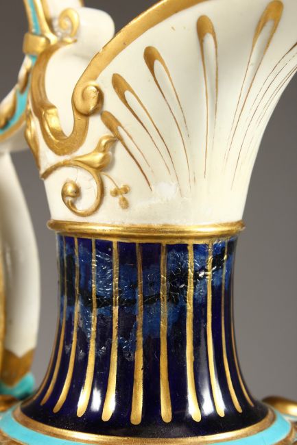 A CONTINENTAL PORCELAIN EWER, dark blue ground with floral and gilt decoration, on a matching stand.